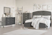 The Kailani Bedroom Set is a masterful combination of modern design, luxurious comfort, and sustainable craftsmanship, perfect for creating a sophisticated and inviting bedroom space. This set includes an upholstered panel bed, dresser, mirror, chest, and two nightstands, all expertly crafted from a durable blend of solid rubberwood, engineered wood, and eco-friendly decorative laminate. The construction ensures long-lasting beauty with superior resistance to scratches, moisture, and stains, making maintenance a breeze. The modern minimalist design features clean lines, a sleek silhouette, and chic ribbed textures, complemented by slim metallic handles and tapered legs that enhance the contemporary aesthetic. The bed, wrapped in plush 100% Polyester Velvet, exudes warmth and sophistication, with a generously padded headboard ideal for relaxation. The matching furniture, with its textured drawers highlighted by gleaming gold pulls and angled legs, adds a touch of glamour to the set, making it a standout in any bedroom. The spacious drawers are designed for seamless functionality, featuring fully finished interiors, full-extension slides, and durable dovetail joinery for smooth, snag-free storage and lasting strength. With easy assembly, requiring just 60 minutes to set up the bed and secure the casegood legs and drawer pulls, the Kailani Bedroom Set offers both style and convenience, making it a perfect addition to any modern home.