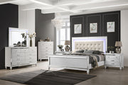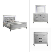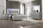 The Valentino Bedroom Set is an opulent collection designed to transform your bedroom into a glamorous retreat. This set includes a bed with touch lighting, a dresser, a lighted mirror, and two nightstands, all meticulously crafted from a durable combination of manufactured and solid woods with decorative embossed inlays for long-lasting quality and distinction. The bed features a crystal button-tufted padded headboard, a gleaming finish, mirrored trims, and alligator embossed inlays, evoking an unparalleled Hollywood glam appeal. Soft LED lighting in the headboard and dresser mirror provides ambient illumination, creating an intimate and luxurious atmosphere. The nine-drawer dresser offers ample storage for clothing, while the three-drawer nightstands conveniently hold your bedside essentials. This exquisite bedroom set combines extravagant style with exceptional craftsmanship, bringing a touch of star quality to your contemporary bedroom suite.
