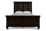 The Sevilla Wood Panel Bed is a masterfully crafted piece that embodies timeless craftsmanship and sophisticated design. Constructed from solid Acacia, enhanced by manufactured wood and Acacia wood veneers, it combines durability with the rich aesthetics of premium woodwork. The artisanal multi-step finish in walnut, featuring hand-distressed details like rasping and indentations, delivers an authentic vintage appeal that adds warmth and character to any bedroom. With its versatile design that blends traditional elegance, rustic charm, and colonial craftsmanship, this bed serves as a captivating focal point, making it ideal for classic, cozy, or historically inspired spaces. Its majestic features, including thick crown moldings, wide picture frame panels, and plank-style insets, ensure it not only commands attention but also offers a sturdy, reliable sleep environment. This is the perfect choice for those seeking a blend of beauty, durability, and a piece that truly stands the test of time.
