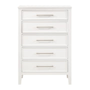 The Andover Five Drawer Wood Chest combines durability, functionality, and modern rustic style, making it an essential piece for any bedroom. Expertly crafted from solid Rubberwood, manufactured woods, and wood veneers, this chest is built to last while highlighting the natural beauty of real wood. The rich finish is the result of a meticulous multi-step process that includes sand-throughs and white glazing, imparting a weathered yet refined appeal that enhances the wood's natural grains and unique characteristics. The Andover chest’s clean lines and cohesive design are complemented by sleek, elongated metallic handles that add a sophisticated contrast to the dark wood finish. Framed drawer fronts add depth and dimension, while the sturdy block-style legs ensure a solid foundation that underscores the chest's robust and enduring structure. The drawers glide smoothly on Kenlin drawer glides, ensuring reliable operation, and feature dovetail joinery, reflecting superior craftsmanship and lasting quality. This chest offers ample storage space while enhancing your bedroom's aesthetic with its timeless and versatile design.
