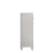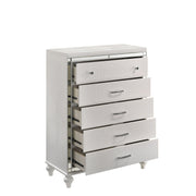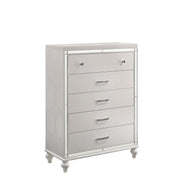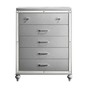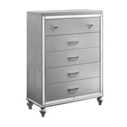 The Valentino 5 Drawer Chest is a testament to enduring craftsmanship crafted from a blend of manufactured and solid woods, adorned with exquisite embossed inlays. Radiating with glitz and glam, its gleaming finish, mirrored trims, crystal-studded drawer pulls, and alligator-embossed accents capture the essence of Hollywood allure. Delight in its thoughtful details, from heirloom-crafted English dovetailed drawers with snag-free interiors to smooth full-extension ball-bearing glides. With an abundance of storage, this chest offers ample space to organize your clothing and belongings effortlessly. Experience luxury and functionality combined in this distinctive piece—a must-have addition to any bedroom sanctuary.