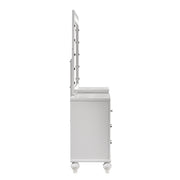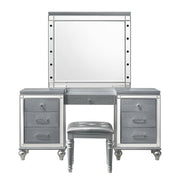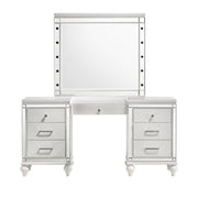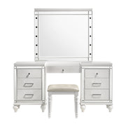 The Valentino Vanity is a stunning addition to any bedroom or dressing area. Made from a combination of manufactured and solid woods with decorative embossed inlays, this set ensures long-lasting quality and distinctive style. The gleaming finish, mirrored trims, crystal-studded drawer pulls, and alligator embossed inlays evoke a Hollywood glam appeal. The seven-drawer vanity table provides ample storage for cosmetics and accessories, including a velvet-lined drawer for jewelry, making it as practical as it is stylish. This exquisite vanity set seamlessly combines functionality with a touch of star quality, bringing an elegant and glamorous touch to your space.