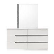 The Paradox Mirror is a perfect blend of contemporary style and superior functionality. Featuring a gloss laminate finish, it offers a sleek, modern look with the added benefits of scratch and water resistance. This mirror is constructed using a combination of solid and manufactured woods, ensuring long-lasting durability. It utilizes low distortion glass to provide a clear reflection, enhanced by the glittery mylar inlay. This mirror not only adds a touch of elegance to any room but also complements the Paradox collection, transforming your space into a high-style retreat.