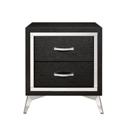 The Huxley 2-Drawer Nightstand offers a blend of contemporary glam and durable construction for your bedroom. This nightstand is carefully crafted from manufactured woods and eco-friendly decorative laminate, ensuring it will last for years. The design features clean lines with metallic accents and flared silver legs for a modern touch. Its rich finish provides a sleek, sophisticated look that is both timeless and modern, with bold highlighting the metallic accents and smooth surfaces for a chic, polished aesthetic. The quality drawer construction includes English dovetail joinery and smooth-rolling center glides for long-lasting operation. Functional and fashionable, this nightstand provides ample storage for bedside essentials, with chic, crystal-studded drawer pulls for easy access.