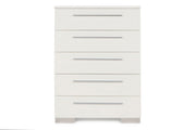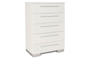 Enhance your bedroom with the Sapphire Modern 5-Drawer Chest in high gloss white. Crafted from high-quality manufactured wood, this chest features a flawlessly smooth, ripple-free surface and a glossy white laminate finish for a sleek, contemporary look. The design is accented by elongated chrome drawer pulls and silver mylar bases that catch and reflect light, creating a striking modern effect. Inside, the roomy drawers offer ample storage with durable dovetail joinery and smooth full-extension slides for effortless use. Combining stylish design with practical functionality, this chest is perfect for adding a touch of sophistication to your space.