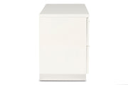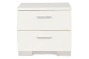 Enhance your bedroom with the Sapphire Modern 2-Drawer Nightstand in high gloss white. Constructed from high-quality manufactured wood, this nightstand features a smooth, ripple-free surface and a glossy white laminate finish for a sleek, contemporary look. The design is highlighted by elongated chrome drawer pulls and silver mylar bases that catch and reflect light, adding a striking modern effect. Inside, the roomy drawers offer ample storage with durable dovetail joinery and smooth full-extension slides for effortless use. This nightstand combines stylish design with practical functionality, making it a perfect addition to any contemporary space.