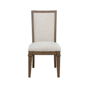 The Mariana Upholstered Side Chairs, sold as a set of two, are crafted from solid Rubberwood, premium manufactured woods, and Acacia wood veneers, offering both beauty and durability. Each chair is meticulously finished in a vintage crème, with hand-distressed details like rasping and clefting that give it a distinctive, time-worn character. Designed for comfort, the chairs feature high-density foam cushions and are upholstered in soft, premium 100% polyester fabric, providing a comfortable seating experience ideal for long meals and gatherings. The sleek silhouette, paired with a tall, upholstered backrest, combines sophistication with exceptional support, making these chairs a stylish yet functional addition to any dining space.