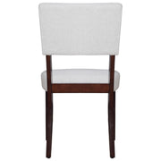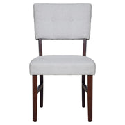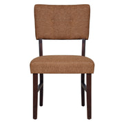 The Tioga Dining Chairs, available in sets of two, bring durable craftsmanship and modern style to your dining space. Each chair is constructed from solid Rubberwood and reinforced with base stretchers, ensuring strong and stable support. With clean lines, a minimalist approach, smooth surfaces, and geometric shapes, these chairs contribute to a sleek contemporary aesthetic. The warm Cherry finish enhances the natural beauty and grain patterns of the wood, adding a touch of elegance. Comfortable seating is assured with button-tufted padded backrests and resilient foam cushions covered in easy-care, 100% polyester fabric. Perfect for any dining room, these chairs combine style, comfort, and durability for an unparalleled dining experience.