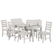 The Echo Dining Set includes a 66" table and side chairs, blending rustic charm with modern function. Crafted from solid Rubberwood, engineered woods, and Oak veneers, it offers durability and style. A multi-step driftwood finish enhances the wood grain with pale gray and white wash tones. The table features a sleek silhouette, a central storage drawer, and lift-top compartments. Classic ladderback chairs with padded upholstered seats ensure comfort and support, making this set ideal for gatherings.