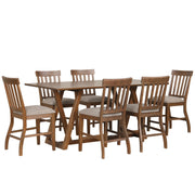 The Putnam Wood Counter Height Dining Set offers a perfect blend of quality craftsmanship and modern design. This set includes a counter-height table and counter chairs, all crafted from solid rubberwood, manufactured woods, and Acacia wood veneers for a stable and long-lasting dining experience. The warm walnut finish is achieved through a meticulous multi-step process that enhances the natural beauty and grain patterns of the wood. The table features mid-century modern design elements with clean lines and a simple rectangular shape, complemented by uniquely shaped legs that add a geometric flair. Measuring 78" in length, it comfortably seats up to six people, making it ideal for family gatherings and entertaining. The counter chairs are designed with ergonomic contours and high-density foam cushions covered in premium 100% polyester fabric, providing exceptional back support and comfort. Choose the Putnam Dining Set for a stylish, comfortable, and enduring addition to your home.