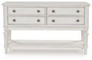 Transform your home into a haven of timeless elegance with this dining server. It pairs a classic antiqued white finish with reeded legs for traditional styling. Four drawers with fully finished interiors offer spacious storage for essentials. The large shelf is perfect for displaying mementos, magazines and more. Whether it's used as a sideboard, entryway table or TV stand, this piece serves your sense of relaxed refinement beautifully.