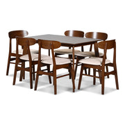 The Morocco Mid-Century Modern Wood Dining Set is a perfect combination of durability, style, and functionality. This set includes a beautifully crafted dining table and elegantly designed chairs, complete with natural cushions that add a touch of sophistication. Constructed from solid rubberwood and Okoume wood veneers, this dining set is built to last, featuring solid tapered table legs, a sturdy table apron, and chair side stretchers that provide unparalleled strength and stability. The clean, sleek lines of the mid-century modern design are enhanced by a warm finish. Perfectly sized for apartments, kitchens, and smaller dining spaces, the 47-inch table comfortably seats up to people, allowing you to maximize your space without sacrificing style or functionality. The chairs feature cradling curved oval seat backs that provide excellent support and comfort, while the 100% polyester upholstered seat cushions are easy to care for and add a modern touch. The Morocco is a statement set that combines elegance, comfort, and practicality. Whether you’re hosting a dinner party or enjoying a quiet meal with family, this dining set promises to make every occasion special.