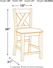 Casual lifestyle design constructed with Acacia veneer and solids. Finished in an antiqued gray wash color. X-back chairs feature solid wood frame and cushioned seat covered with a textured polyester fabric with nail head trim. Matching backless bench features nail head trim. D388-113 has storage shelves on one end with a sturdy stretcher. Backless stools with upholstered saddle seat design. D388-223 counter height table and three bar stools. Single smooth gliding drawer. Includes 2 USB ports and AC power outlet; UL listed. D388-223 stool dimensions: 16"W x 14"W x 25"H. D388-425 rectangular dining table and six X-back chairs. Chairs feature solid wood frame and cushioned seat covered with a gray textured polyester fabric with nail head trim. D388-425 chair dimensions: 19"W x 22"W x 38"H. D388-224/230 has solid hardwood frames with metal back supports and footrest. Swivel seats feature a gray textured polyester fabric with nail head trim. Finished in an antiqued gray wash color.