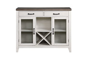 The Richland Sideboard in Stonewash Gray combines practicality and style, making it an essential addition to any dining space. Built to last, it is expertly crafted from solid Rubberwood, durable manufactured woods, and genuine Acacia wood veneers, offering a blend of strength and the natural charm of real wood. The hand-applied finish in vintage cream and gray highlights the wood's beautiful grain patterns, adding a timeless, classic appeal. Designed to be the perfect serving companion, this sideboard features velvet-lined drawers for secure storage of flatware, spacious compartments for china and serving pieces, and a built-in wine rack that keeps your favorite bottles close at hand. Whether you're hosting a dinner party or storing your dining essentials, the Richland Sideboard combines function and elegance effortlessly.