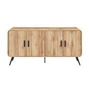 The Rowan 63" Sideboard doubles as a stylish TV stand with mid-century modern flair. Crafted from eco-friendly manufactured wood in a warm oak finish, it features rounded corners, black hardware, and tapered legs. Four cabinet doors conceal spacious shelves—perfect for storing media, electronics, or dining essentials. A versatile piece that works beautifully in living or dining spaces.