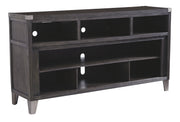 Make watching TV a joy. This TV stand's rustic-industrial style—with a gray finish, squared edges, zinc-tone corner bracket accents and nailhead detailing—is sure to complement any contemporary decor. Several vented open cubbies offer impressive shelf space, convenient for keeping all of your electronic gear within reach. Handy cutouts keep cords out of sight. The stand's large center opening accommodates a shelving insert (included) or an optional fireplace insert (sold separately).