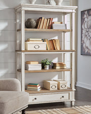 Elevating the art of traditional cottage styling, this bookcase is your heavenly home office realized. Its antiqued two-tone aesthetic blends a chipped white with a distressed wood tone top for added charm. The bookcase’s clever balance of shelf and drawer space beautifully works.