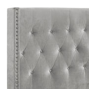 The Huxley Upholstered Bed in Gray combines contemporary glam with durable construction for a stylish and comfortable bedroom centerpiece. This set includes a headboard, footboard, two side rails, and a slat kit, all crafted from manufactured woods and eco-friendly decorative laminate for long-lasting use. The bed features clean lines and a crystal button-tufted headboard with silver studded trim, offering a touch of luxury and comfort. Its inviting finish provides a sleek, modern look that complements contemporary interiors, creating a sophisticated and calming atmosphere. The neutral tone pairs beautifully with the metallic accents and luxurious upholstered headboard, adding a touch of glamour and cohesion to the overall design. The 100% polyester velvet fabric exudes elegance with its soft feel and plush padding, ensuring maximum comfort.