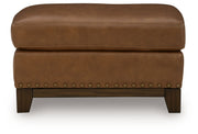Effortlessly blending contemporary and classic elements for a truly timeless look, this ottoman offers a fresh take on transitional style. Its robust silhouette is coupled with skillfully matched leather and faux leather upholstery, while nailhead trim offers a touch of subtle sophistication. A pleasingly plump cushion with jumbo stitching provides exceptional comfort. We’re all in—how about you?