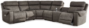 Stylish in design and function, this power reclining sectional with console creates a comfortable place to gather with family and friends. The sectional, upholstered in heavyweight faux leather with quilting and jumbo stitching, invites you to sink into plush opulence at an affordable price. The zero-wall power reclining mechanism features infinite positions for comfort. Conveniently plug in your devices to the USB charging station. Appealing to those with an eye for sumptuous design and high-tech features, this gunmetal gray sectional will always be a win.