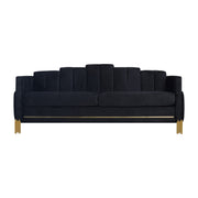 Introducing the Empire Sofa, a durable and stylish addition to your living space. Crafted with an eco-friendly manufactured wood frame, this 3-seater couch ensures lasting strength and durability. Upholstered in luxurious 100% midnight black polyester velvet fabric, it adds a touch of sophistication to any room. The modern metro style, featuring tiered panels and gleaming gold accents, captures the enchanting ambiance of a city skyline under the stars. Experience added ambiance with blue LED accent light strips on the side panels, effortlessly controlled with the touch of a button. Enjoy supportive seating with high-density full foam cushions, providing resilient and comfortable support. Upgrade your living room with the Empire Sofa, where style meets durability for unparalleled comfort.