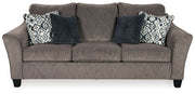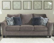 This sofa sets the scene for a modern space full of casual flair. Its textured chenille with solid microfiber upholstery provides a luxuriously soft feel that’s inviting. Gently flared arms and plush seat cushions welcome comfort and relaxation. The on-trend slate-colored upholstery offers a perfect background for the four decorative pillows to pop with beauty.