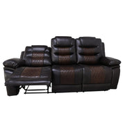 Enhance your living space with the Nikko Dual Recliner Sofa with Hidden Cupholders and Drop Down Snack Tray . This sofa, constructed with hardwood and plywood frames, promises long-lasting durability and stability. Luxurious comfort is ensured with resilient foam cushions and pocket coil support, providing a cozy place to lounge. The two-tone fabric, made from a blend of 80% polyester and 20% PU, offers the soft touch and look of leather while remaining breathable. Distinctive details such as nailhead trim, diamond stitch pattern seats, double wrapped headrests, and expert tailoring make this sofa stand out in any home. Enjoy practical lifestyle features like the center back cushion that conveniently drops down into a snack tray complete with beverage holders, and hidden pull-out cupholders discreetly housed under the armrests. Plush pillowed arm and headrests, reclining backs, and comfortable footrests provide the perfect place to unwind. Upgrade your living room with the Nikko Dual Recliner Sofa and experience unparalleled comfort and style.