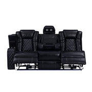 The Orion II 3-Piece Power Motion Sectional with 3 Recliners and Adjustable Headrests in black is the ultimate blend of style, comfort, and functionality. This set includes a Left Arm Facing Power Sofa with 2 recliners, a Right Arm Facing Power Console Loveseat with 1 recliner, and a Wedge, all built with a combination of premium hardwoods and high-quality manufactured wood for exceptional durability and longevity. The luxurious black upholstery, crafted from 80% polyester and 20% synthetic leather, offers a supple feel and comfortable seating. Effortless reclining mechanisms support up to 350 pounds, allowing you to lay back and relax in your favorite position, with headrest and footrest adjustments available at the touch of a button for optimal comfort. Experience unparalleled comfort with high-density foam and pocket coil cushions wrapped in Dacron polyester, ensuring both support and luxury. The sleek design features expert tailoring, with white contrast stitching that highlights the distinctive diamond pattern on the seats and arms, along with plush-wrapped headrests and track arms for added luxury. The contemporary design includes lift-up pillowed arms revealing convenient storage compartments, a sofa center back cushion that folds down to access two cupholders and a snack tray, and a loveseat center console with a storage cubby and two silver drink holders, seamlessly blending style and practical functionality. Enhance your home cinema setup with theater lighting accenting the base of both the sectional sofa and loveseat, immersive stereo sound from Bluetooth speakers, and convenient wireless charging pads and USB charging ports to keep your devices powered. Additional features include reading lamps under the center sofa headrest and a drop-down center back cushion housing two wireless charging pads. The ORION II sectional is the perfect addition to any living space, offering a luxurious and practical seating solution.