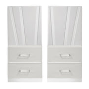 The Europa decorative back panels are designed for use with the Europa Nightstand. The Europa's sophisticated look is achieved through a gleaming white finish, mylar accents, and acrylic drawer pulls. Quality craftsmanship is evident in the eco-friendly manufactured woods, assembled for durability, with surfaces finished in a glossy white topcoat and padded upholstery. Upscale extras include silver mylar pedestal bases and decorative panel accents, enhancing the glamour of these nightstands. The sturdy, well-constructed drawers feature dovetail joinery and ball bearing glides for a durable, easy-glide operation, with interiors finished for snag-free storage. The two-drawer nightstands offer ample storage for bedside essentials. Choose the Europa Nightstands to add a touch of modern luxury and practicality to your bedroom.