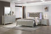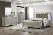 Discover the Radiance Bedroom Set, meticulously crafted to offer unparalleled stability and durability from a combination of Solid Rubberwood and manufactured woods. Its semi-gloss lacquer finish lends a silky, modern touch to this captivating collection. Glossy textured inlays, mylar trim, and crushed crystal decorative laminates are seamlessly incorporated throughout, creating an opulent appeal. Indulge in relaxation with the crystal-studded, button-tufted headboard, providing a sumptuous spot for lounging with a good book. The 6 Drawer Dresser and 5 Drawer Chest feature heirloom quality English dovetail drawer assembly and smooth full-extension drawer glides for effortless operation. Finished interiors and top drawers lined with felt ensure snag-free storage. Immerse yourself in a soothing ambiance with the soft blue LED lighting in the headboard and mirror, controlled by a touch switch. Transform your bedroom into a haven of luxury and comfort with the Radiance Queen Bedroom Set.