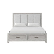 The Fiona Storage Bed is a testament to craftsmanship and design. Constructed with Acacia solids, manufactured woods, and oak veneer, this bed is a harmonious blend of strength and the natural allure of wood. The wood grain comes to life under a multi-step finish, featuring wire brushing and white glazing, culminating in a mist gray hue that complements any room. Classic elements like picture frame moldings and tapered legs are paired with modern drawer pulls to create a timeless piece. Its transitional style seamlessly adapts to both traditional and contemporary spaces. For comfort that doesn’t compromise on luxury, the headboard is upholstered in soft, 100% polyester fabric, offering support for bedtime reading. The footboard integrates two spacious drawers, providing a clever storage solution for blankets and linens, optimizing your space with elegance and efficiency.