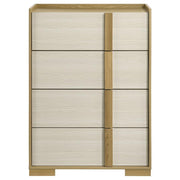 Add a touch of modern elegance to your bedroom with this stylish four-drawer chest. Inspired by contemporary Italian design, this chest features a sleek blend of natural wood tones and crisp white panels crafted from durable, easy-care melamine. The drawers, equipped with metal extension glides and pin-construction joinery, ensure smooth operation and offer ample storage for your clothing and accessories. The vertical lines of the natural finish hardware add a sophisticated touch, perfectly complementing the chest’s clean lines and modern aesthetic. Elevate your home decor with this functional and chic four-drawer chest, designed to bring both beauty and practicality to your space.