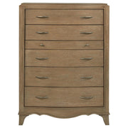 This French Provincial-inspired chest of drawers offers both timeless elegance and practical storage. Crafted from solid poplar, engineered wood, and mango veneer, it features a washed mango finish that enhances the natural wood grain. Five spacious drawers provide ample storage for clothing and essentials, while a felt-lined top drawer offers protection for delicate garments. Sleek metal handles add a refined touch, and smooth drawer glides ensure effortless operation, making this chest a perfect blend of beauty and functionality.