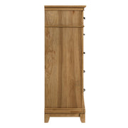 The Sunstone Chest combines durable, quality construction with solid rubberwood, manufactured woods, and hickory wood veneers, creating a strong and stable five-drawer chest. This collection features a classic, rustic style with natural wood finishes and clean, simple lines, complemented by neutral tones and a minimalistic design that fosters a serene and inviting atmosphere. The clear, natural finish, achieved through a hand-applied stain, enhances the wood's grain patterns and characteristics. The chest's elegant design includes a raised base, full return moldings, and contrasting hardware, adding a sophisticated touch to any bedroom. Heirloom drawer quality is ensured with durable dovetail joinery, providing longevity and strength, while three-stage steel ball glides allow for smooth, full-extension operation and support for heavy loads. Functional extras include five spacious drawers for ample clothing storage and a velvet-lined top drawer to protect delicate items. The Sunstone Chest is a practical and stylish addition, offering both timeless design and optimal functionality for your bedroom.