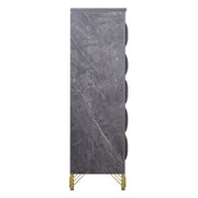 The Symmetry 5-Drawer Chest in Charcoal Gray blends form and function with modern elegance. Crafted from premium woods with a gray marble laminate, it offers durability and a sleek aesthetic. Ultra-soft gray fabric drawer fronts, adorned with gold metal and mylar accents, add sophistication. English dovetail drawers glide smoothly on ball bearings for lasting strength. Providing ample storage and style, this chest is a perfect choice for enhancing any living space with elegance and utility.