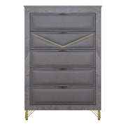 - Glimmering Glamour: Trendsetting gold metal and mylar accents dazzle against the ultra-soft gray fabric drawer fronts, while intricate detailing adds a touch of sophistication to the elegantly designed legs.