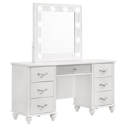 Traditional elements merge with luxe accents to create this glam vanity and mirror set. Perfectly suitable for endless color palettes, this charming, chic vanity features a bright white finish offset by polished chrome handles encrusted with glimmering diamond-like accents. To each side of you are spacious drawers for keeping cosmetics, styling accessories and more. A narrow top drawer, accented with a silver finish panel, further lends to the glamorous effect of this vanity dresser and invites you to store readily available essentials. Resting atop this vanity is a framed mirror surrounded by LED lighting disguised as exposed bulbs that give it a regal Hollywood vibe.