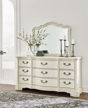 Add a touch of romance to your bedroom with this dresser and mirror. Its antiqued white painted finish and serpentine-shaped silhouette are the definition of easy elegance. Custom-designed aged pewter-tone hardware adds surprisingly casual appeal.