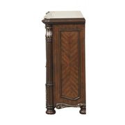• Luxurious Finish: A rich mahogany brown multi-step finish highlights intricate burl inlays and antique gold carvings. The deep tones and elegant detailing create a timeless, luxurious look.