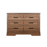The Coventry Hall Dresser in Pecan combines durability and style, making it a standout piece for any bedroom. Made from high-quality manufactured woods and topped with eco-friendly decorative laminate, this dresser offers a robust and stable storage solution. Its modern rustic design harmoniously blends the warmth and texture of natural wood with clean lines and minimalism, providing a versatile aesthetic that fits various decor styles. The eco-friendly laminate not only mimics the natural look of wood but also resists scratches, stains, and moisture, ensuring lasting beauty and functionality. With features such as clean lines, picture frame moldings, bracket feet, and contrasting hardware, the dresser brings a contemporary touch to any space. The six spacious drawers, constructed with durable dovetail joinery and equipped with ball bearing glides, ensure smooth operation and ample storage for clothing. The Coventry Hall Dresser is a practical and stylish choice for anyone seeking a combination of elegance and functionality in their bedroom furniture.