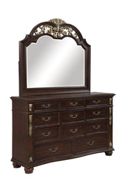 The Royal Classics Maximus Dresser Mirror in Madeira Brown is a stunning piece that combines timeless elegance with masterful craftsmanship. Meticulously crafted from solid poplar and premium birch veneers, this mirror is designed for lasting beauty and durability. The multi-step finish enhances the natural grain of the wood, while delicately burnished gold tipping highlights the intricate Baroque-inspired carvings, adding a touch of luxury to its design. The beveled, low-distortion glass offers perfect clarity, ensuring a flawless reflection with both beauty and functionality. This mirror pairs perfectly with the Royal Classics Maximus dresser, bringing an air of regal sophistication to your space.