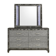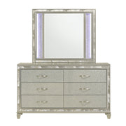 Introducing the Radiance Lighted Mirror, meticulously designed to complement the Radiance 6 Drawer Dresser. Crafted from a blend of Solid Rubberwood and engineered woods, this mirror ensures unparalleled stability and durability. Its semi-gloss lacquer finish adds a silky, contemporary touch to your space. Adorned with Glossy textured inlays, mylar trim, and a crushed crystal decorative laminate frame, this mirror exudes opulence and glamour. Featuring a clear, low distortion beveled glass mirror, it delivers true reflections, while the LED lighting accents your surroundings, casting a sparkling glow against the luxurious frame. Elevate your bedroom decor with the functional elegance of the Radiance Lighted Mirror.
