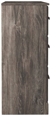 With its clean-lined look and modern attitude, this dresser is a fresh style awakening. A warm gray hue over replicated oak grain easily complements other furniture finishes. Smooth drawer fronts with antiqued pewter-tone handles complete the aesthetic.