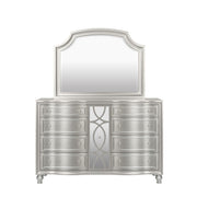 Meet the Reflection Mirror in Silver, expertly crafted from solid Pine and high-quality manufactured wood for enduring strength and durability. Its glamorous matte silver finish adds an elegant frame to the dresser mirror, enhancing any bedroom decor with sophistication. Experience true reflection with the low-distortion beveled glass mirror, providing a clear view for everyday use. Designed to complement the matching Reflections Dresser, this mirror is not just a functional piece—it's a marvel of craftsmanship, offering unparalleled clarity and style to your bedroom ensemble.