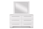 Complete your bedroom with the Sapphire Dresser Mirror in high gloss white. Expertly crafted from high-quality manufactured wood, this mirror features a flawlessly smooth, ripple-free surface and a glossy white laminate finish for a sleek, contemporary look. The wide frame, adorned with silver mylar, encases crystal-clear, low-distortion beveled glass for a perfect reflection. This mirror combines exceptional functionality with elegant design, adding sophistication to any space while seamlessly complementing modern interiors. Easy to clean and maintain, it’s an ideal choice for enhancing your bedroom's style and functionality.