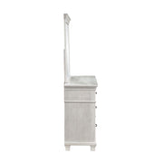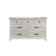 The Silver Sands Dresser combines durability and quality construction, crafted from solid pine, manufactured woods, and oak wood veneers for a strong and stable piece. Its transitional style merges clean, simple lines with a rustic wood finish, creating a calm and inviting atmosphere. The misty finish, achieved through a meticulous multi-step, hand-applied process, offers a light, weathered look that highlights the natural grain and mineral patterns of the wood. Elegant design features, including a raised base, full return and dentil moldings, and contrasting hardware, add a sophisticated touch. Heirloom-quality drawers with dovetail joinery and three-stage steel ball glides ensure smooth, full-extension operation and can support heavy loads. With seven spacious drawers, including velvet-lined top drawers to protect delicates, this dresser provides ample storage for clothing essentials. Combining style, durability, and functionality, this dresser is a practical and elegant addition to any bedroom.