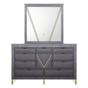 The Symmetry 10-Drawer Dresser blends luxury and function, elevating any bedroom with its glamorous appeal. Crafted from premium woods with an eco-friendly gray marble laminate, it’s a true statement piece. Ultra-soft fabric drawers, adorned with gold metal and mylar accents, add sophistication. Spacious English dovetail drawers glide smoothly on Kenlin ball-bearing tracks for durability. Offering ample storage and timeless elegance, this dresser is the perfect touch of glamour.