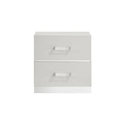 The Europa 2 Drawer Nightstand in white combines sleek, modern design with practical functionality. This nightstand features a gleaming white finish, mylar accents, and acrylic drawer pulls for a sophisticated look. Constructed with eco-friendly manufactured woods, it is built for durability, with surfaces finished in a glossy white topcoat. Upscale extras include a silver mylar pedestal base that elevates the glamour of this piece. The drawers are well-constructed with dovetail joinery and ball bearing glides, ensuring a durable, easy-glide operation, with interiors finished for snag-free storage. The two-drawer nightstand provides ample storage for all your bedside essentials. Choose the Europa 2 Drawer Nightstand for a blend of contemporary style and practical design.
