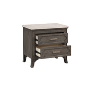 Elevate your bedside with the Lisbon Marble Top Nightstand in Gray. Crafted from Acacia solid wood and eco-friendly embossed oak laminate, this nightstand promises lasting strength and durability. Its multi-step gray finish enhances the natural beauty of the wood, infusing your space with a sophisticated ambiance. A genuine white marble top adds distinct character and provides a long-lasting surface. The heirloom drawer construction ensures durability and functionality, with English and French dovetail joinery, full extension glides, and finished interiors. Top drawers are lined with felt to protect delicate items. Combining traditional elements like bracket feet and picture frame moldings with modern brushed pewter hardware and a fresh gray finish, this nightstand offers a timeless style with a contemporary twist. The Lisbon Marble Top Nightstand is the perfect blend of elegance and practicality for your bedroom.
