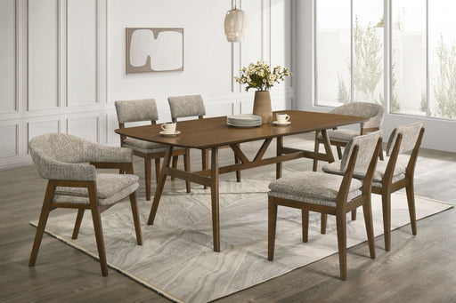 The Miller 7-Piece Mid-Century Modern Dining Set includes a 78" table, 4 side chairs, and 2 arm chairs in a warm walnut finish. Expertly crafted fr...